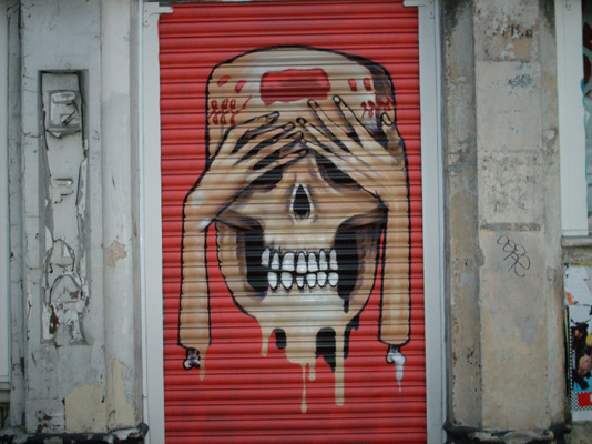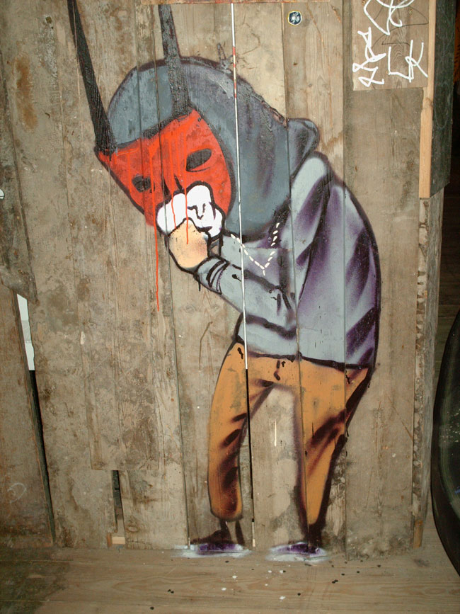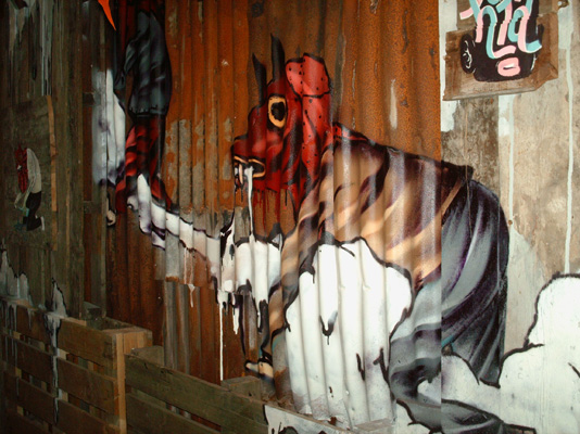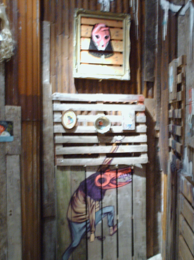 Leaving behind the shed, I am now nose stuck onto my first wall looking at them – wood panels, trays, cardboard, pallets all painted with rather unfamiliar looking characters. It all became clear though after talking to a member of staff: The Fiesta Resistance actually feature Mexican artists and clearly you can get the feeling that the Aztecs civilization may have been of their source of inspiration.