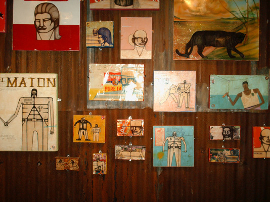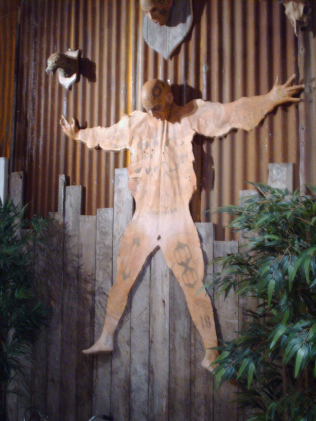 The next piece along though might not come from that same inspiration and actually scared me a little but the sight of that bumpy car randomly parked next to the shed made me feel again at ease. It is rather impressive and right there on the wall looking at you: a flayed skins of Mexican gang members with everyone of their tattoos reproduced in authentic detail!