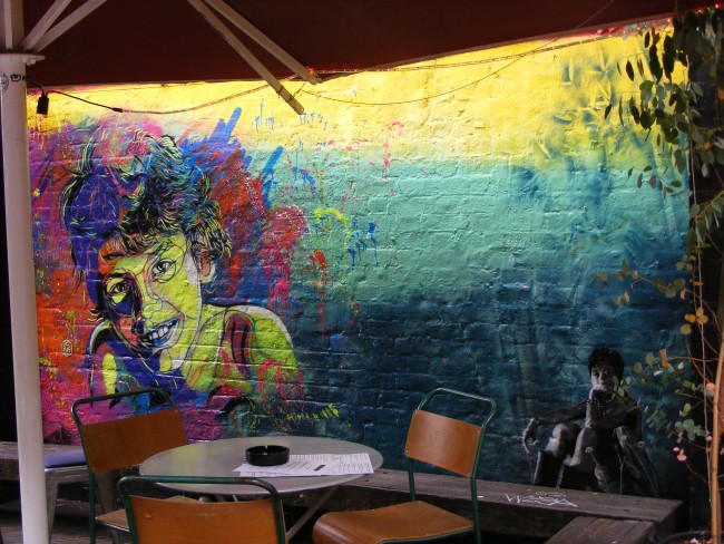 I had not been to Cargo for a while and must thanks the Black Rat gallery to be where it is that is thru the Cargo garden otherwise I would have missed the great street art on the walls proudly standing between decking chairs, palm trees and happy customers. Check those out below.