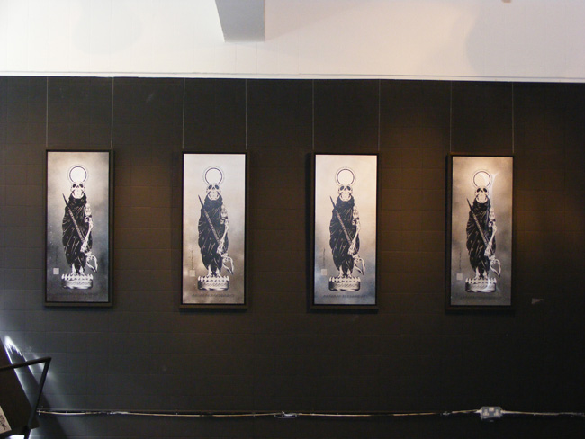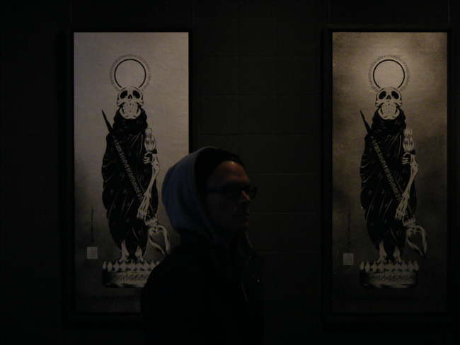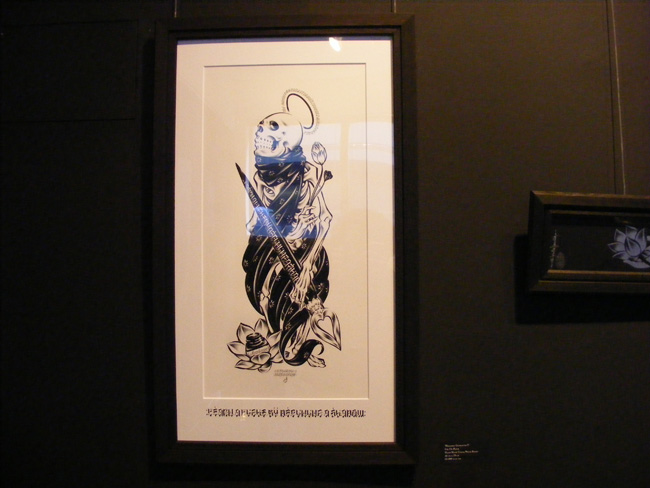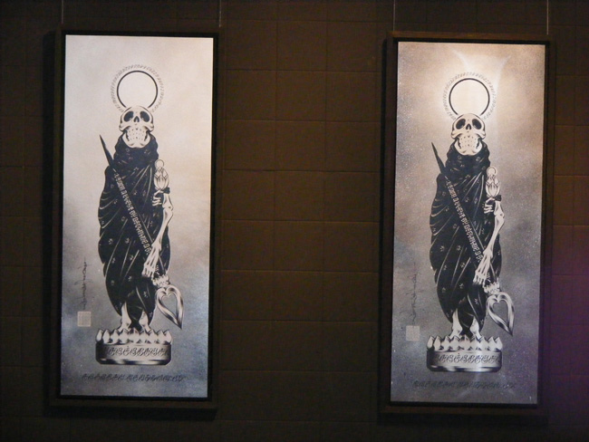 Inside Stolen Space and looking around Usugrow’s artwork and it is obvious to me: if you are into black and white with punk rock visuals such as skulls and roses, you may well forget the price tags and get the gallery staff to immediately stick up one of those red stickers next to your favorite piece.