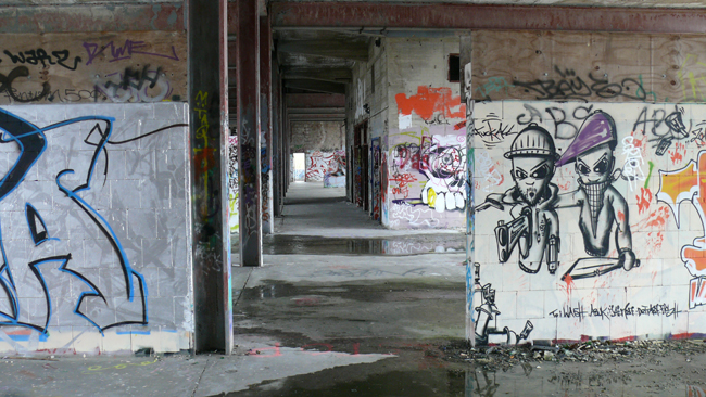 The listening station was decommissioned at the end of the cold war. There were many plans for it’s use in the future, all of which fell through. With that, over the years it has attracted the likes of vandals, youths, graffers and urban explorers. Amongst the broken glass from all the smashed windows and beer bottles, the collapsing stairwells, the gaping holes from the dilapidated flooring and the pitch black hallways, a diverse collection of pieces, dubs, tags, paste ups and stencils can be found.